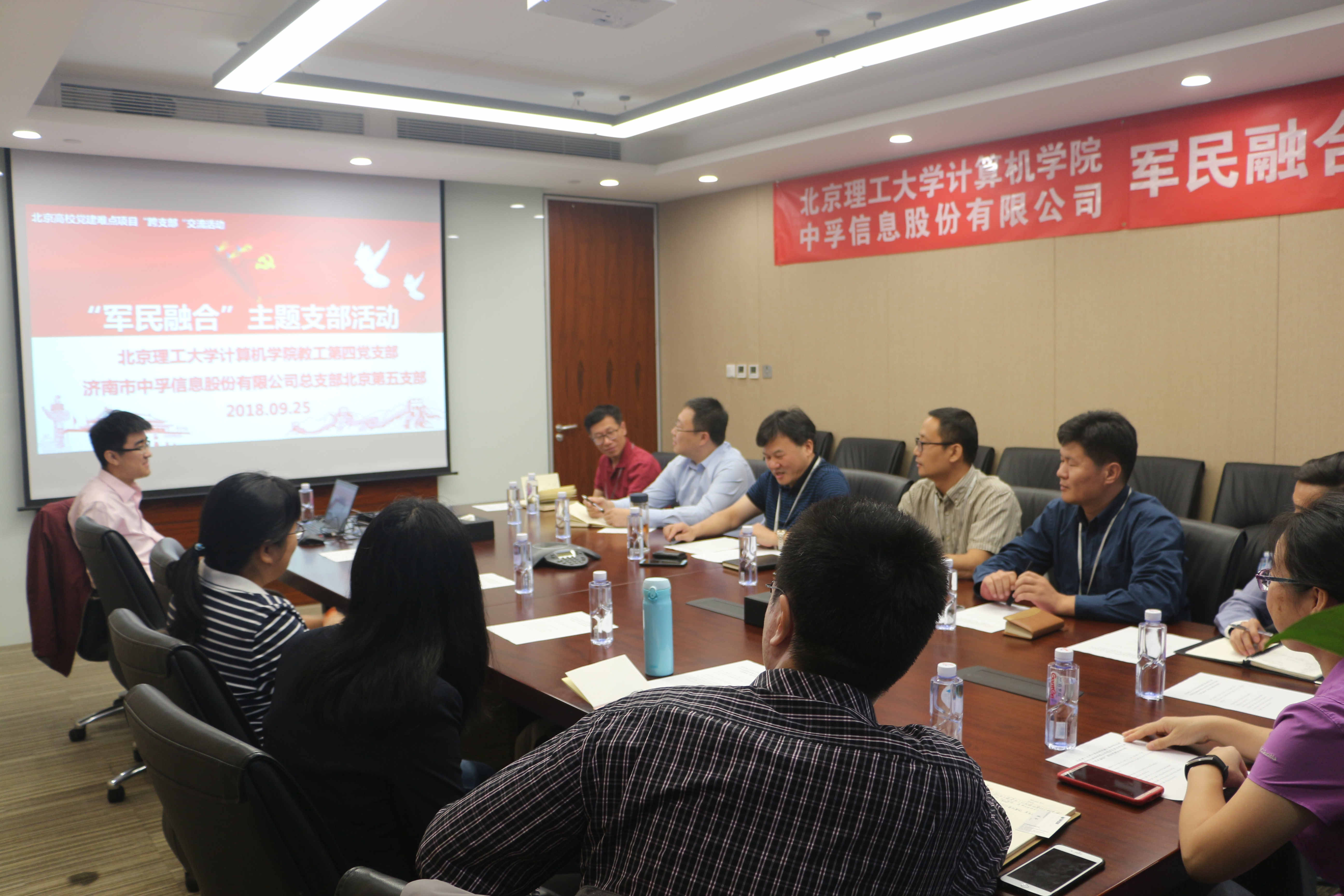 2018年9月25日上午,6686体育(中国)官方网站 - 登录入口第五党支部与北京理工大学计算机学院教工第四党支部,以“军民融合”为主题,进行首次联合党建交流活动。北京理工大学计算机学院教工第四党支部书记祝烈煌、6686体育官网首页党总支书记张太祥以及双方部分党员同志参加了活动。