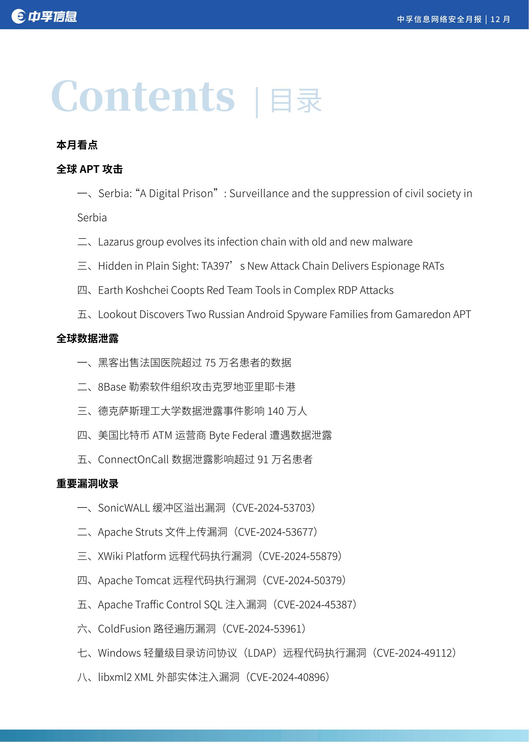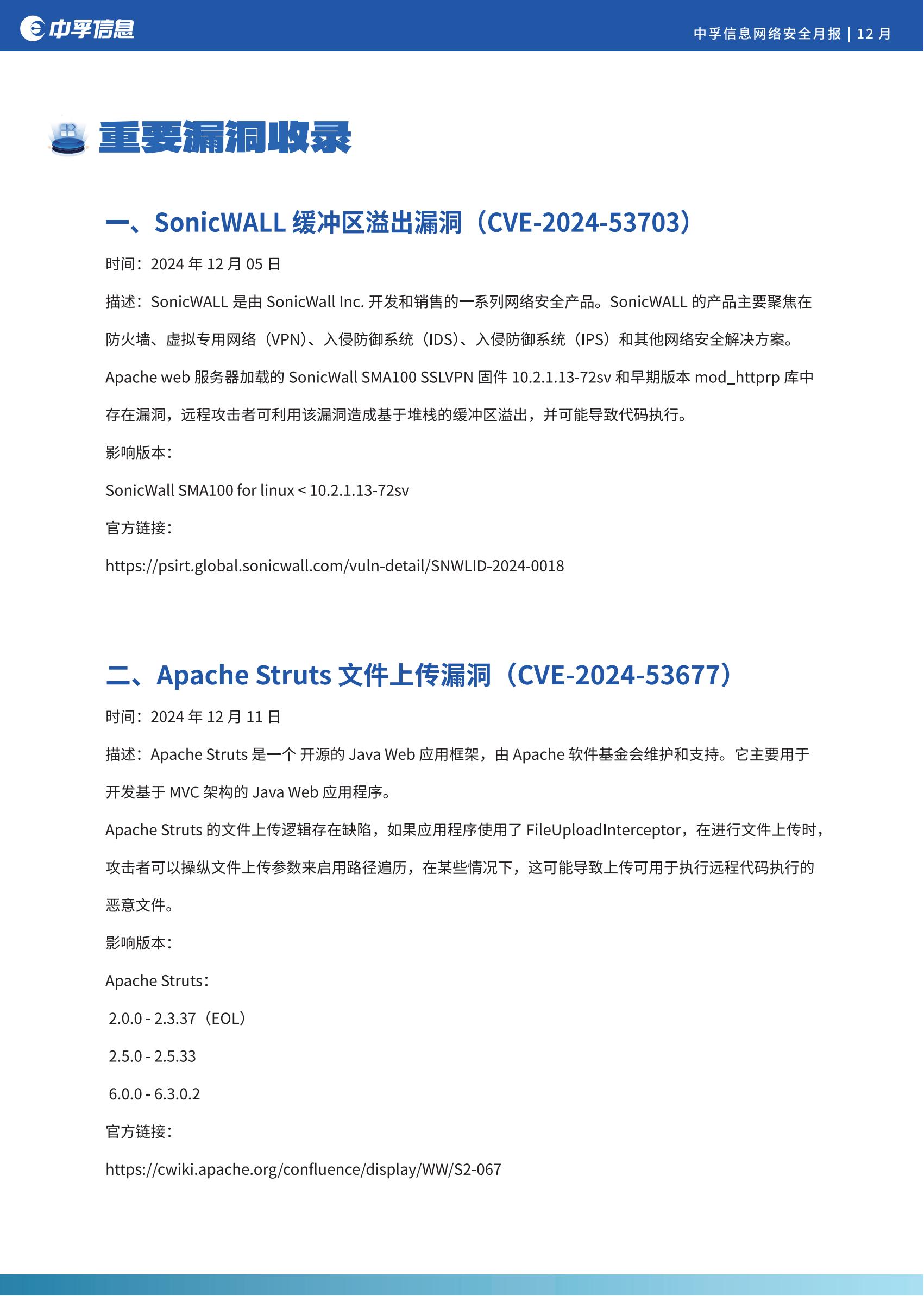 在本月收录的安全漏洞里,影响较大且值得关注的是:Apache Tomcat 远程代码执行漏洞(CVE-2024-50379); XWiki Platform 远程代码执行漏洞(CVE-2024-55879; Apache Struts 文件上传漏洞(CVE-2024-53677); SonicWALL 缓冲区溢出漏洞(CVE-2024-53703)等。